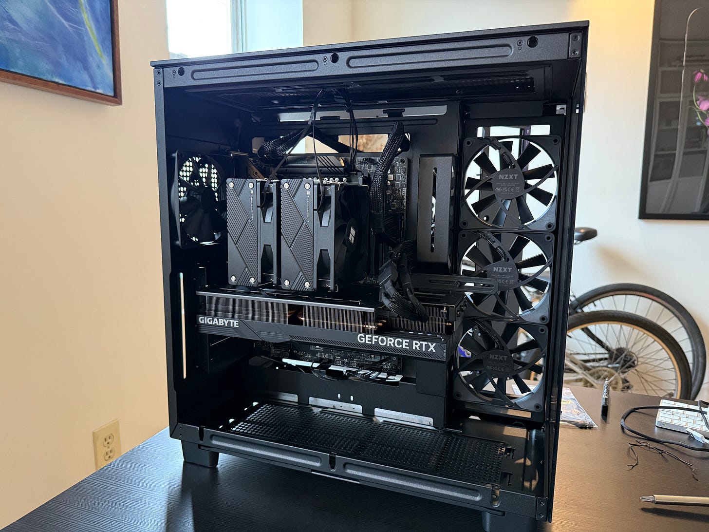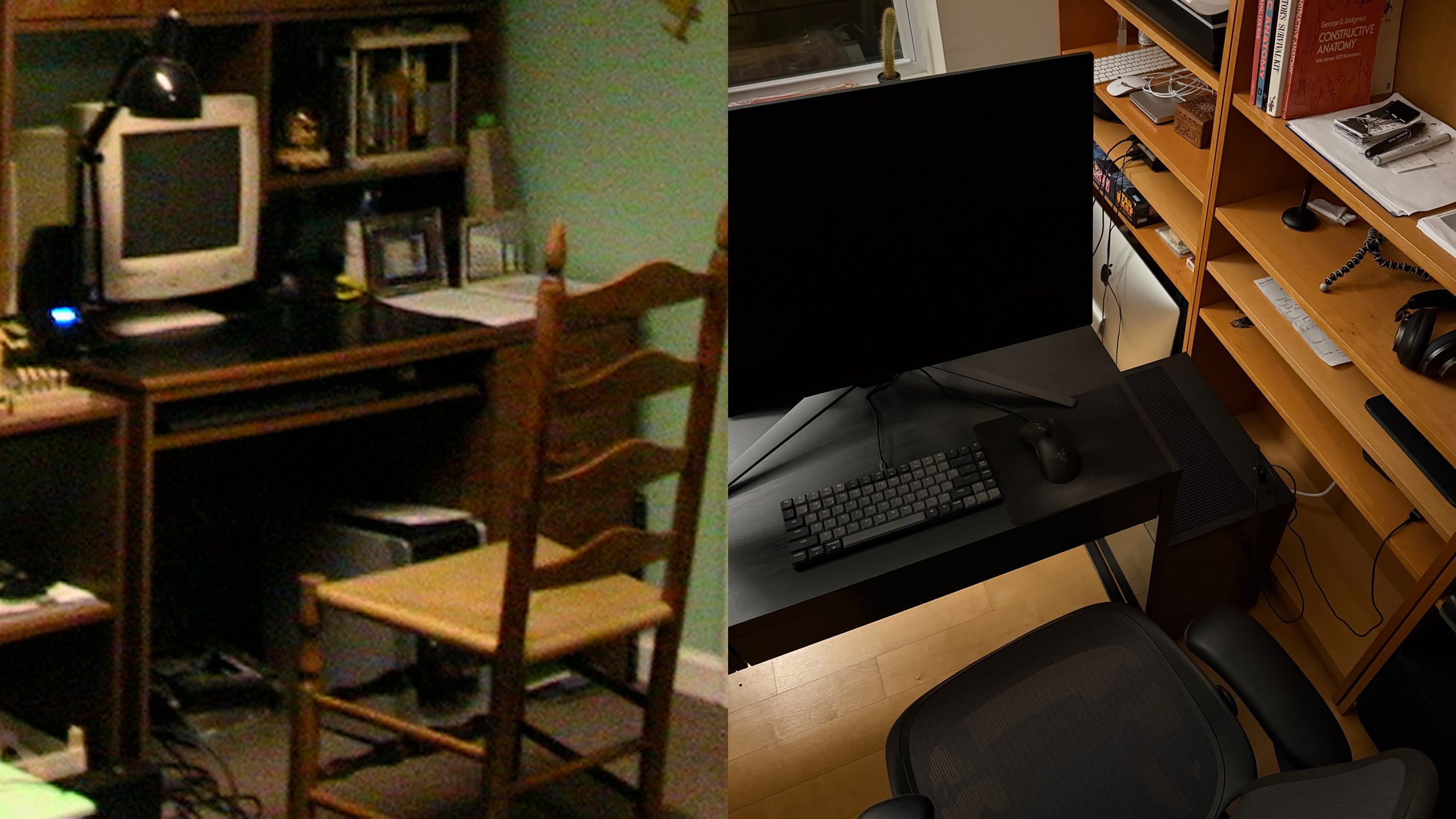 I have never done anything remotely like this before, so it was a great triumph for me that it powered on and worked beautifully the first time! Also, tremendously grateful for a small business grant from my city! I decided to put it to use quickly in the overhauling of my workstation. I previously used Apple Boot Camp, but as that has been discontinued, I now have two computers connected to one display. Below is a comparison from my last PC setup almost 18 years ago! (also you can see my 2017 iMac on the floor, a bit sad, if you look closely)